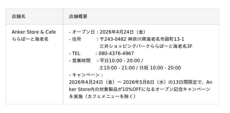 アンカー・ジャパン株式会社の子会社として常設直営店Anker Storeの運営事業を担うアンカー・ストア株式会社(本社:東京都港区、代表取締役CEO:猿渡 歩)は、2026年4月24日(金)に「Anker Store & Cafe ららぽーと海老名」をオープン。また同月に、「Anker Store ららぽーと福岡」、「Anker Store Outlet 那須」、「Anker Store ららぽーと富士見」の計3店舗をオープンいたします。