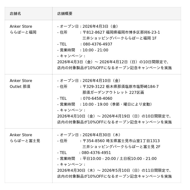 また、同月には「Anker Store ららぽーと福岡」、「Anker Store Outlet 那須」、「Anker Store ららぽーと富士見」の計3店舗をオープンいたします。