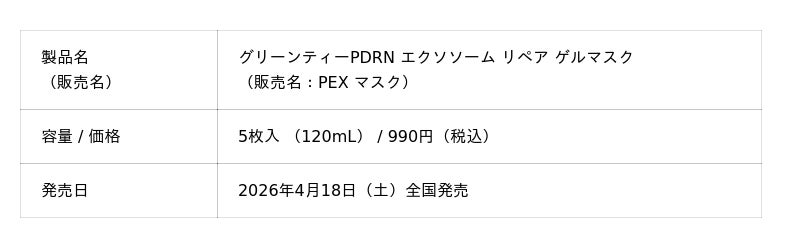 乾燥や睡眠不足などでハリやツヤが不足しがちな肌に。グリーンティーPDRN(TM)*¹とエクソソーム*²配合の美容液をたっぷり含浸ツヤのある潤い弾む肌へ整えるゲルマスク