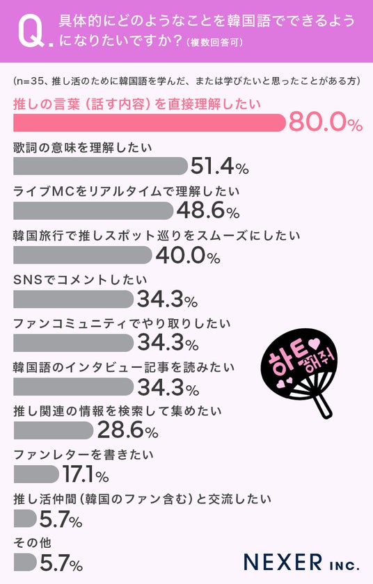 今回の調査では、韓国の芸能人やアーティストを応援している人の9割が推し活の中で言葉の壁を実感しており、7割が実際に韓国語を学びたいと感じていることが明らかになりました。