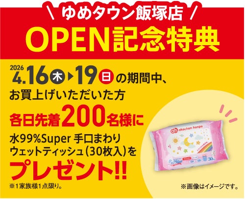 株式会社赤ちゃん本舗(本社:大阪市中央区 https://www.akachan.jp )は、福岡県飯塚市の商業施設 「ゆめタウン飯塚」内に、『アカチャンホンポ ゆめタウン飯塚店』を2026年4月16日(木)にオープンいたします。また、オープンを記念いたしまして期間限定セールやポイントアップ企画などを実施いたします。