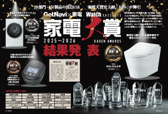 20部門・151製品の頂点に輝いたのは? 総合グランプリは、全人類が毎朝座る“あの場所”をヘルステックで変革した“家電”が戴冠。4年かかったという開発チームの苦闘など開発&マーケティング担当者にインタビューする。また、20部門の金賞~銅賞までの上位結果と、家電有識者たちの総意で選出した6つの特別賞、家電の近未来を予測させるアイテムを表彰したGetNavi賞なども同時発表。