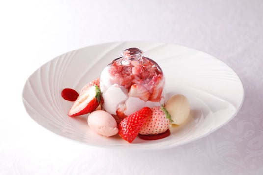 2種の苺を贅沢に使い、華やかなパフェに仕立てました。グラスから広がる苺の杏仁豆腐やソースと、バニラ・ストロベリー・ミルクの3種の自家製アイスクリームとのハーモニーをお楽しみください。