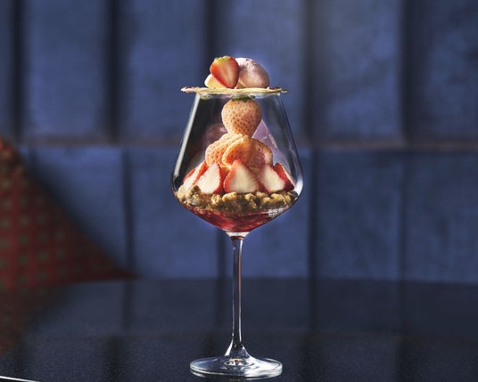 白イチゴと国産いちごをふんだんに使用し、見た目の美しさと味わいのバランスを追求した一品。グラスの中に丁寧に重ねられた層が、食べ進めるごとに異なる表情を見せ、最後まで飽きることなく楽しめます。