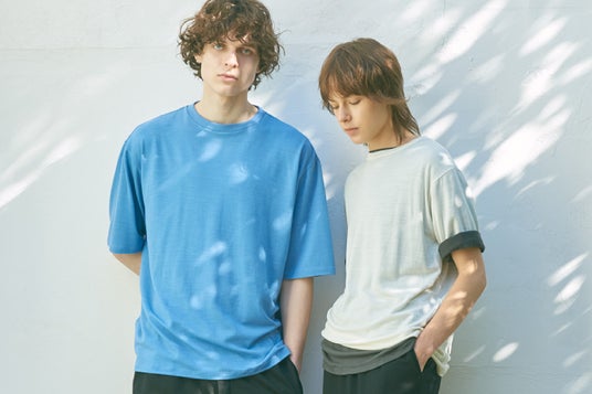 素材が持つフィット感とシアー感を活かし、一枚でもインナーとしても使いやすいアイテム。衿・袖口を細二本仕様にし、また肩のラインを細くすることで、カジュアルすぎず女性らしい華奢な印象に。肌に触れる縫い糸には、滑らかな肌触りとストレッチ性を兼ね備えたウーリー糸を採用し、着心地の良さにもこだわりました。