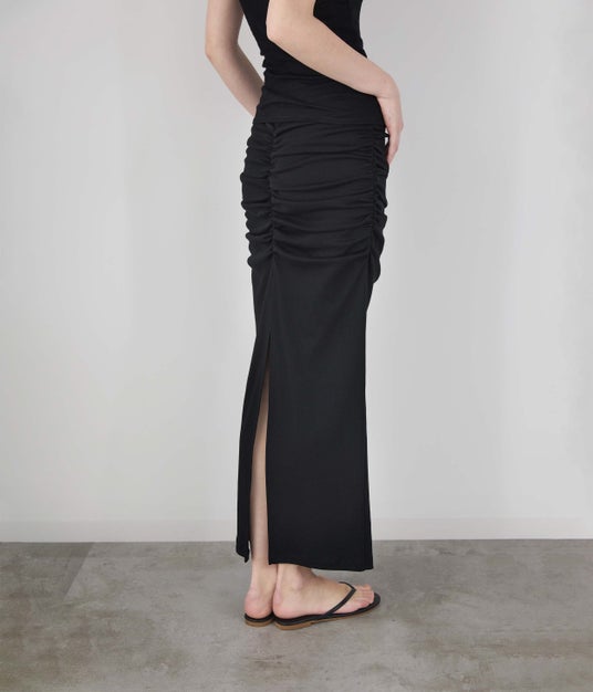 高密度なリブ組織「COTTONY(R) RIB」を使用したギャザースカート。ウエスト裏にゴムを直接縫い込むことで、厚みを抑えたフラットな仕上がりに。ウエストからヒップにかけてのギャザー寄せデザインが、ボディラインを自然にカバー。縦のラインを強調する美しいIラインシルエットに、背面の深スリットでしなやかな足運びをプラスしました。
