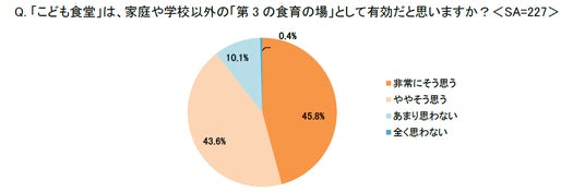 また、「『こども食堂』は、家庭や学校以外の『第3の食育の場』として有効だと思いますか?<SA>」という質問では、「非常にそう思う」(104)、「ややそう思う」(99)を合わせて約9割の親が有効性を支持する回答となりました。これらの結果から、こども食堂は単に食事を提供する場所にとどまらず、子どもが安心して過ごせる「第3の食育の場」として関心が高まっており、他者とコミュニケーションを図れる貴重な地域コミュニティとしての役割が、期待されていることがうかがえる結果となりました。