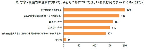 「学校・家庭での食育において、子どもに身につけてほしい要素は何ですか?<MA>」と聞いたところ、「食べ物を大切にする心」(200)が最も多く、次いで「正しい栄養知識」(182)が続きました。
