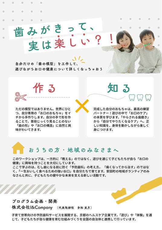 子育て世帯向け予防歯科サービスを展開する株式会社I&Company(本社:京都府京都市、代表取締役:多和 実月)は、高知県安田町教育委員会と連携し、放課後子ども教室において年間を通じた体験型歯科プログラムを提供いたします。放課後子ども教室とは、小学校の余裕教室等を活用し、地域の方々の参画を得て、子どもたちに学習やスポーツ・文化活動等の多様な体験活動を提供する場です。安田町では平成17年から本事業を実施しており、令和7年度現在、町内児童の約45%が登録し、延べ2,200人が利用しております。
