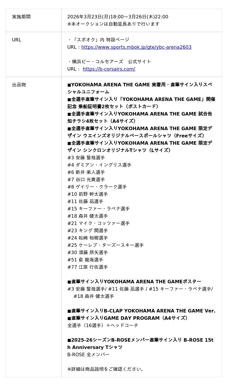 株式会社モバオク(本社:東京都渋谷区、代表取締役社長:小一原 宏樹、以下モバオク)がエンゲート株式会社(本社:東京都中央区、代表取締役:城戸 幸一郎、以下エンゲート)と業務提携し提供するスポーツチーム公式オークションサービス「スポオク」にて、B.LEAGUE所属の横浜ビー・コルセアーズは2026年3月23日(月)より『YOKOHAMA ARENA THE GAME MEMORIAL AUCTION』を開始します。