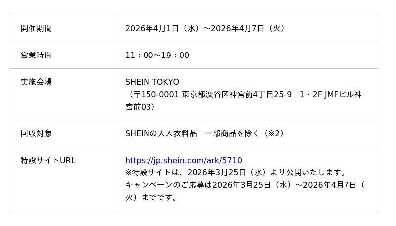また好評につき、4月も本キャンペーンの開催が決定いたしました。第21弾となる今回は、2026年4月1日(水)から2026年4月7日(火)までの期間、東京・原宿にあるショールーム「SHEIN TOKYO」にて開催いたします。本キャンペーンでは、SHEINでご購入いただき不要となった大人衣料品(最大3点まで)をお持ちいただいた場合、専用コーナーに用意された新しい洋服と交換することができます。さらに、SNSへご投稿いただいた方には、追加でもう1点アイテムがもらえるキャンペーンも実施いたします。