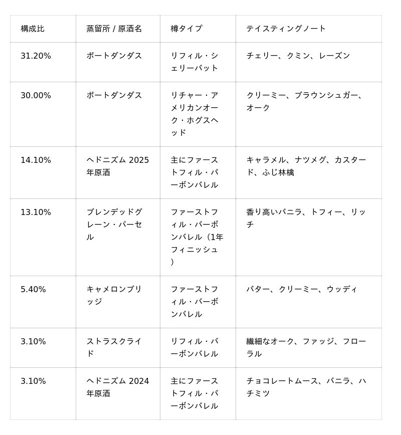 - 希少な原酒構成: ポートダンダス蒸留所のリフィルシェリーバット(31.2%)を中心に、ストラスクライドやキャメロンブリッジの古酒を含む、全7種の貴重な原酒を贅沢に使用しています。