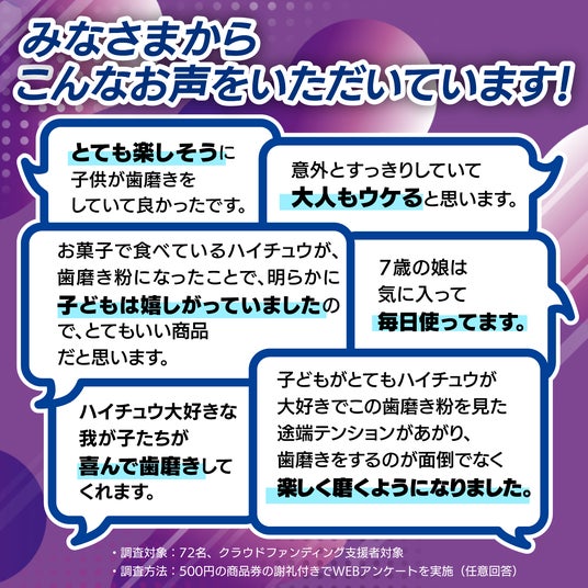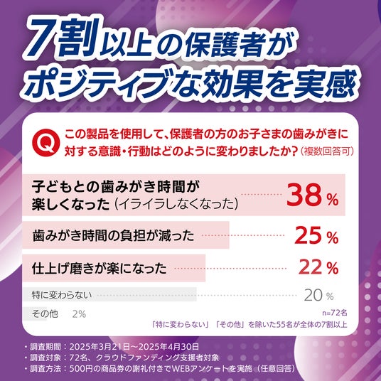 2025年2月にアタラシイものや体験の応援購入サービス「Makuake(マクアケ)」にて応援購入者の募集をしたところ、歯みがきイヤイヤ期のお子さまがいらっしゃるご家族からのご支持をいただき、目標金額を早期に達成いたしました。このたび、製造販売の体制が整いましたので、販売ルートを拡大して通年販売を開始いたします。