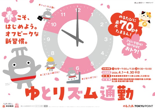 当社は、2026年4月1日(水)から4月30日(木)までの期間限定で、快適な通勤を体感いただくために、朝のピーク時間帯を避けてご乗車いただいた方にTOKYU POINT※1を加算するサービス「春こそ、はじめよう。ゆとリズム通勤」(以下、本サービス)を実施します。