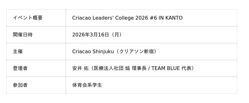 医療法人社団 焔(理事長:安井 佑)は、2026年3月16日(月)、Criacao Shinjuku(クリアソン新宿)が主催するリーダー育成プログラム「Criacao Leaders' College 2026 #6 IN TOKYO」において、理事長の安井 佑(以下、安井)が特別講演を行ったことをお知らせします。