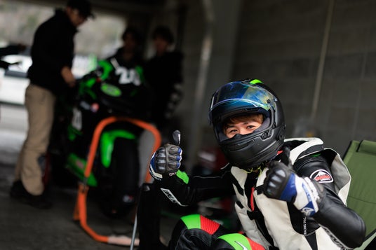 もともと妻がNinja ZX-25Rを所有してたのですが、大型二輪免許を取得してステップアップしたことで、そのNinja ZX-25Rが手元に残っていました。そんな中、昨年岡山国際サーキットで開催された全日本ロードレース選手権を観戦しに行き、カワサキプラザブースで展示されていたNinja Team Green Cup仕様のNinja ZX-25Rを目にしました。そこでプラザスタッフの方から詳しく話を聞き、「それなら家にあるNinja ZX-25Rで挑戦できるかもしれない」を思ったのがきっかけです。その後、近くのカワサキプラザを探して相談し、同じカワサキプラザに通うお客さんと一緒に出場することになりました。