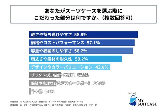 続いて、こだわりをもってスーツケースを選んだ人を対象に「スーツケースを選ぶ際にこだわった部分は何か」を尋ねる設問への回答では、1位が「軽さや持ち運びやすさ」で58.9%、2位が「価格やコストパフォーマンス」で57.1%、3位が「容量や収納のしやすさ」で56.2%という結果になりました。また、4位以降も回答比率40%を超える回答が複数並ぶ形となり、この結果から、こだわりをもって選んだスーツケースを所有する人が、その際にこだわった部分は多岐にわたることがわかりました。