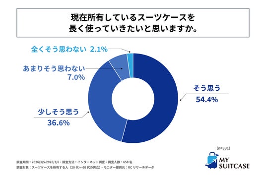 また、こだわりをもって選んだスーツケースを所有する人を対象に「現在所有しているスーツケースを長く使っていきたいと思うか」を尋ねる設問への回答では、1位が「そう思う」で54.4%、2位が「少しそう思う」で36.6%、3位が「あまりそう思わない」で7.0%という結果になりました。1位と2位の各回答の比率を合計すると91.0%となり、この結果から、こだわりをもって選んだスーツケースを所有する人の9割以上が、現在所有しているスーツケースを、程度の差こそあれ、長く使いたいと考えていることが明らかになりました。