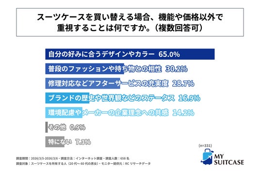 調査の最後、こだわりをもって選んだスーツケースを所有する人を対象に「スーツケースを買い替える場合、機能や価格以外で重視することは何か」を尋ねる設問への回答では、1位が「自分の好みに合うデザインやカラー」で65.0%、2位が「普段のファッションや持ち物との相性」で30.2%、3位が「修理対応などのアフターサービスの充実度」で28.7%という結果になりました。この結果から、こだわりをもって選んだスーツケースを所有する人の6割以上が、スーツケースを買い替える場合、機能や価格以外で「自分の好みに合うデザインやカラー」を重視することが判明しました。