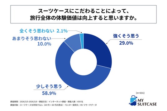 次に、こだわりをもって選んだスーツケースを所有する人を対象に「スーツケースにこだわることによって、旅行全体の体験価値は向上すると思うか」を尋ねる設問への回答では、1位が「少しそう思う」で58.9%、2位が「強くそう思う」で29.0%、3位が「あまりそう思わない」で10.0%という結果になりました。1位と2位の各回答の比率を合計すると87.9%となり、この結果から、こだわりをもって選んだスーツケースを所有する人の約9割が、スーツケースにこだわることによって旅行全体の体験価値が、程度の差こそあれ、向上すると考えていることが判明しました。