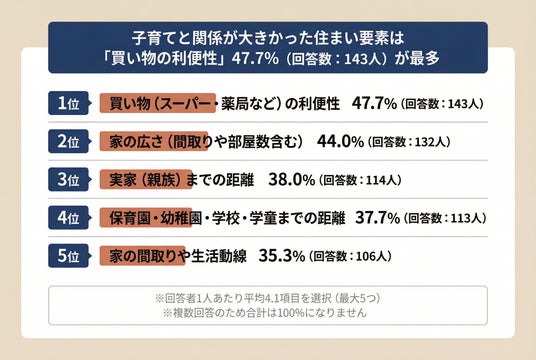 ・子育てと関係が大きい住まい要素1位は「買い物・生活の利便性」47.7%(143人)