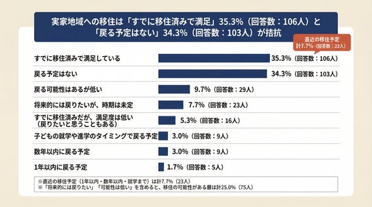 ・実家地域への移住意向は「すでに移住済みで満足」35.3%(106人)と「戻る予定はない」34.3%(103人)が拮抗。直近の移住予定(1年以内~就学まで)は7.7%(23人)に留まる