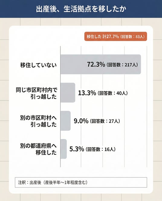 出産後の生活拠点は「移住していない」72.3%(217人)――一方で里帰り出産は65.3%(196人)。住まい決めの重視点は「祖父母など親族からのサポート」44.0%(132人)が最多、子育てと住まいの関係では「買い物・生活の利便性」47.7%(143人)が最多