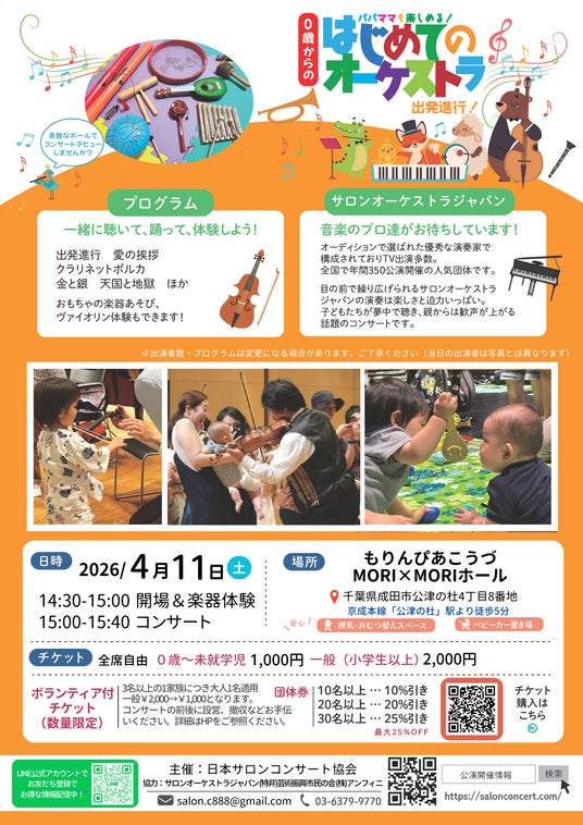 『成田「0歳からの・はじめてのオーケストラ」』が2026年4月11日 (土)にもりんぴあこうづ MORI×MORIホール(多目的ホール)(千葉県 成田市 公津の杜 4-8)にて開催されます。