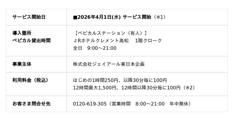 ○この度、四国旅客鉄道株式会社(JR四国)ならびに株式会社JR四国ホテルズと連携し、高松駅すぐの「JRホテルクレメント高松」で4月1日よりサービスを開始します。ベビーカーは、お子さまに人気の923形ドクターイエローベビーカーを貸出いたします。