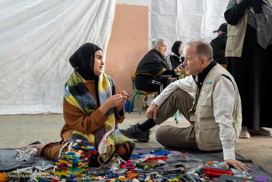 避難所となっているベイルートの学校で、12歳のハジャルさんから話を聞くユニセフのテッド・チャイバン事務局次長(レバノン、2026年3月17日撮影)(C) UNICEF/UNI965196/Choufany