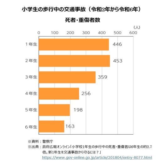 学年別にみると、小学校1年生は446人で、最も少ないのは小学校6年生の163人となっており、小学1年生の歩行中の死者・重傷者は6年生の約2.7倍に上ります。
