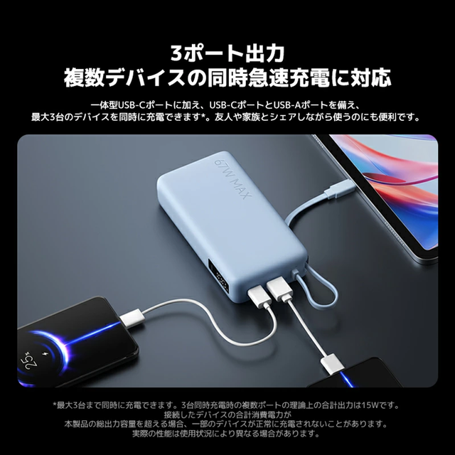 USB-Cケーブルに加えて、USB-C×1ポートとUSB-A×1ポートを備えており、最大3台のデバイスを同時に充電できます。