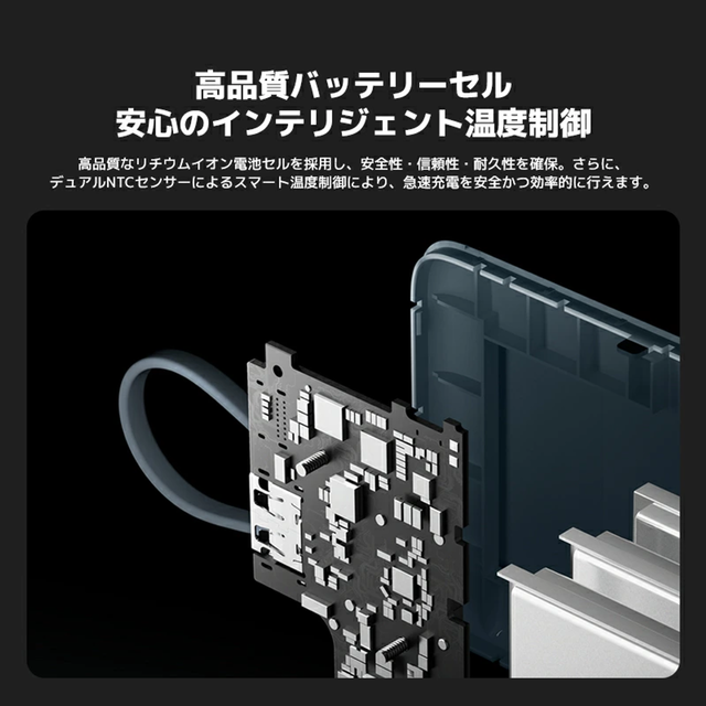 高品質なリチウムイオン電池セルを採用し、安全性・信頼性・耐久性を確保。デュアルNTCセンサーによるスマート温度制御により、安全かつ効率的に急速充電できるのも助かりますね。