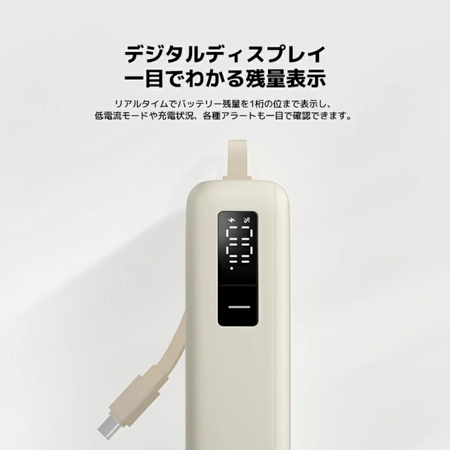 USB-Cケーブル内蔵ですぐに充電できて便利。デジタルディスプレイ搭載でバッテリー残量がひと目で確認できる