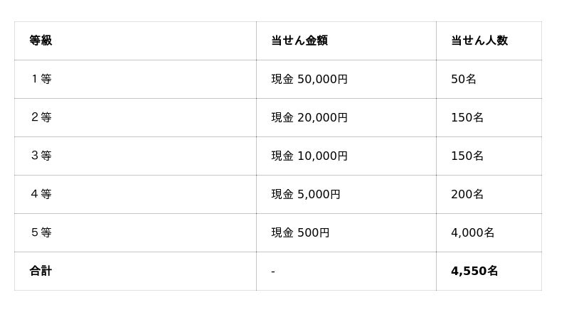 抽せんで1等から5等まで当せんしたかた4,550名さまに現金キャッシュバック。