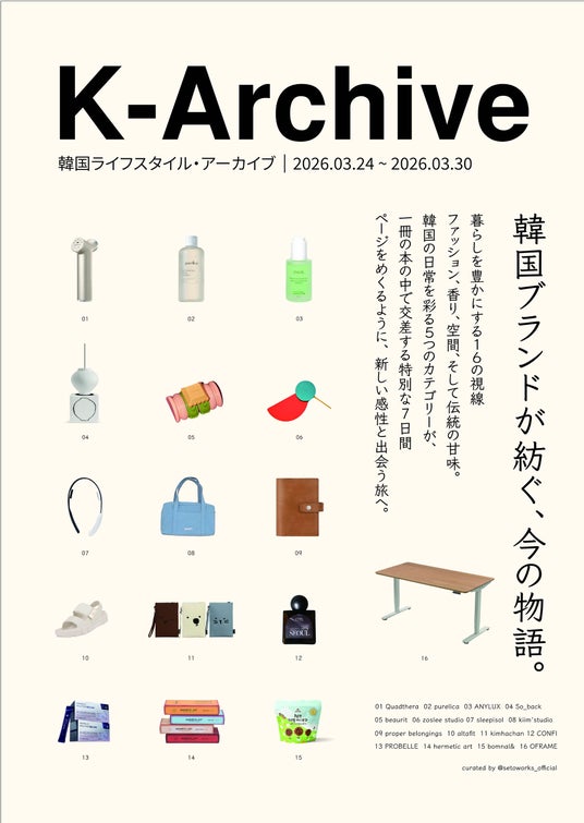 株式会社セトワークスは、2026年3月24日(火)から3月30日(月)まで、二子玉川 蔦屋家電にて韓国のプレミアムライフスタイルブランドを集めたポップアップストア「K-Archive」を開催いたします。本イベントは、各ブランドの背景にある物語を一冊の本の章をめくるように体験できる、エッセイのような空間構成となっています。