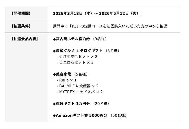 キャンペーン期間中に「P3」の定期コースを初回購入いただいた方を対象に、宮古島ホテル宿泊券や高級グルメなどの豪華景品が当たる特別なご褒美をご用意いたしました。