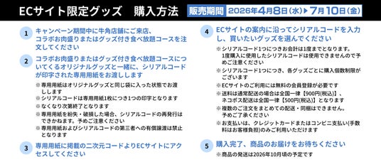 ※コラボお肉盛り or グッズ付き食べ放題コースに付いてくる「オリジナルグッズ」と一緒に、シリアルコードが印字された専用用紙をお渡しします ※専用用紙に掲載の二次元コードからECサイトにアクセスし、シリアルコードを入力すると、ECサイト限定グッズを購入できます