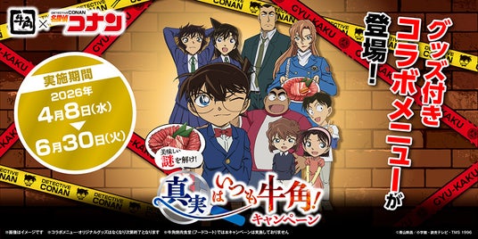 コロワイドグループの株式会社レインズインターナショナルが展開する「牛角」は、劇場版「名探偵コナン ハイウェイの堕天使」が2026年4月10日(金)に公開されることを記念して、TVアニメ「名探偵コナン」とのタイアップ「美味しい謎を解け!真実はいつも牛角!キャンペーン」を、2026年4月8日(水)から6月30日(火)までの期間限定で実施いたします。