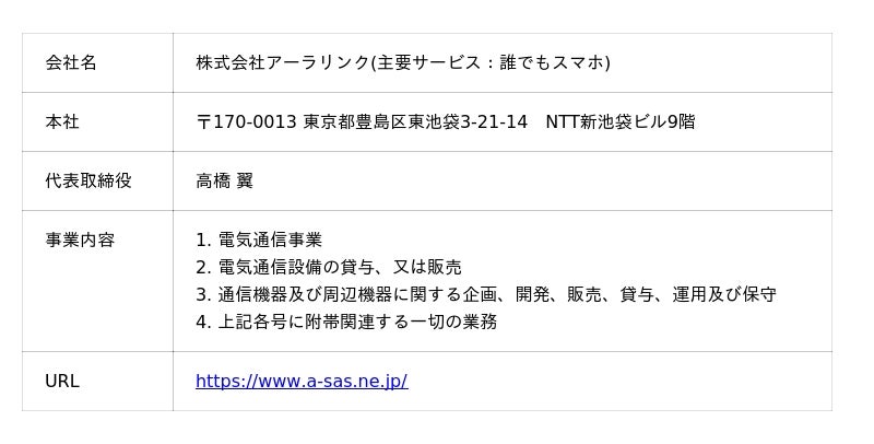 株式会社アーラリンクが提供する「誰でもスマホ」は、過去の滞納履歴などにより携帯電話の契約が困難な方でも、本人確認書類があれば契約可能なサービスです。独自の審査を採用することで、通信というライフラインを速やかに提供し、社会的な孤立を防ぎます。これまでに累計11万人を支援し、多くの方々の就職や社会復帰へと繋がる第一歩をサポートしています。【会社概要】