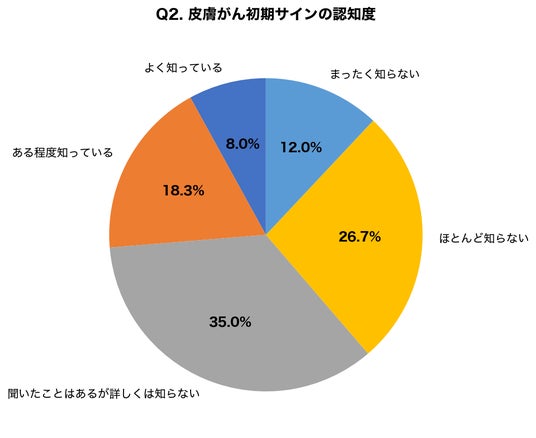 皮膚がんの初期サインについて「よく知っている」「ある程度知っている」と回答した人は26.3%にとどまりました。7割以上が初期サインを認識できていない可能性があり、早期発見の機会を逃すリスクが懸念されます。