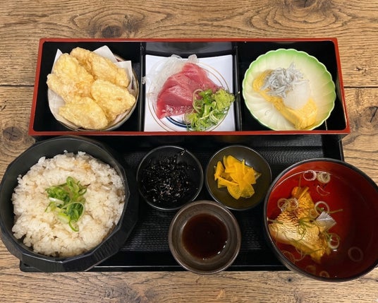 初鰹、筍、しらす、桜鯛など、春の旬を一度に楽しめるランチ限定の御膳です。みずみずしい初鰹の刺身をはじめ、筍と鶏の天ぷら、出汁巻きしらすおろしのせ、桜鯛の鯛めし、鯛兜のうしお汁を揃え、春ならではの味わいをバランスよくお楽しみいただけます。