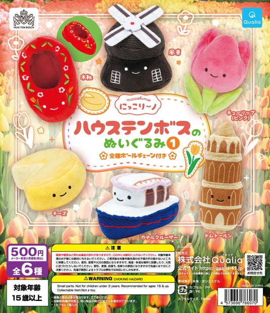 ハウステンボスを彩る代表的なシンボルである風車やチューリップなどが、ニコニコ笑顔がトレードマークのぬいぐるみになって登場します。ラインナップは「風車」「木靴」「チューリップ」「チーズ」「カナルクルーザー」「ドムトールン」の全6種。価格は1回500円。