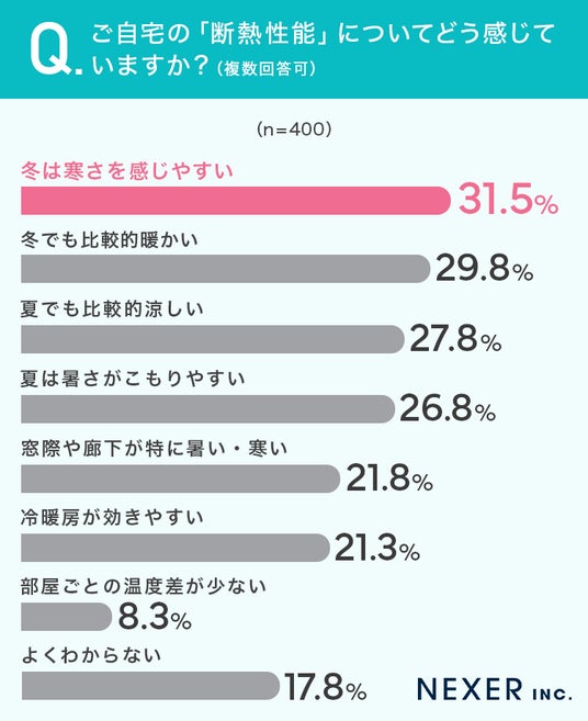 その結果「冬は寒さを感じやすい」が31.5%で最も多く、次いで「冬でも比較的暖かい」が29.8%、「夏でも比較的涼しい」が27.8%、「夏は暑さがこもりやすい」が26.8%と続きました。