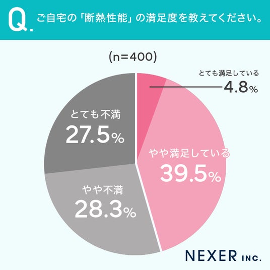 その結果「やや満足している」が39.5%で最多となった一方で、「やや不満」が28.3%、「とても不満」が27.5%となり、合わせて55.8%の方が断熱性能に不満を抱えていることがわかりました。