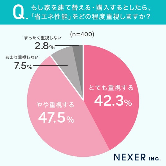 その結果「とても重視する」が42.3%、「やや重視する」が47.5%で、合わせて89.8%の方が省エネ性能を重視すると答えました。「あまり重視しない」は7.5%、「まったく重視しない」は2.8%です。