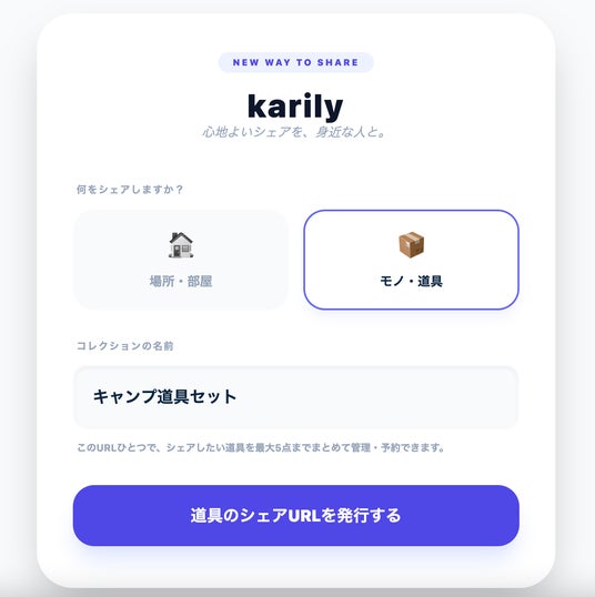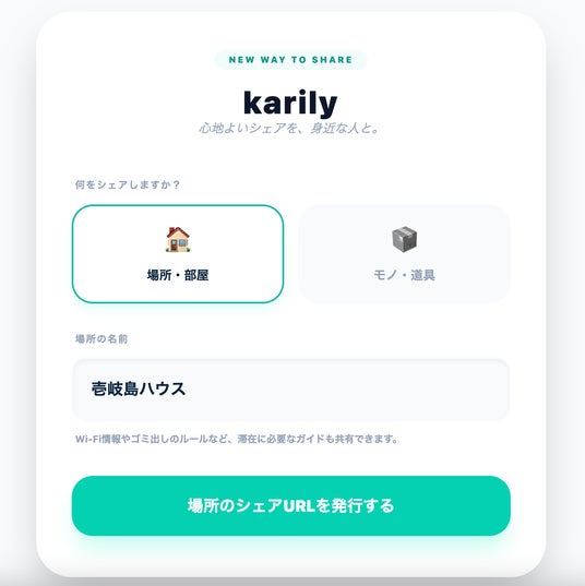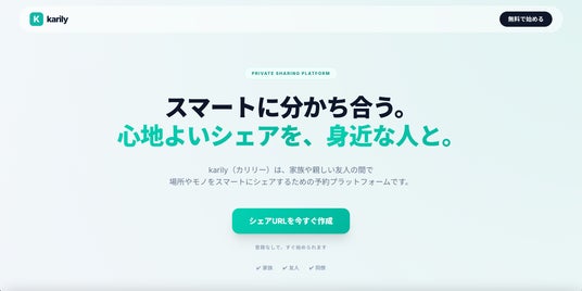 家族や友人との場所やモノの利用予約を、共有URLひとつで管理できるシェアプラットフォーム「karily(カリリー)」が、2026年2月25日に公開されました。