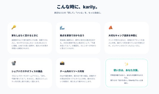 karilyは、単なる予約管理ツールにとどまらず、身近な人同士の「心地よいシェア体験」を支えるプラットフォームを目指します。