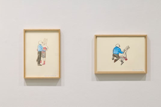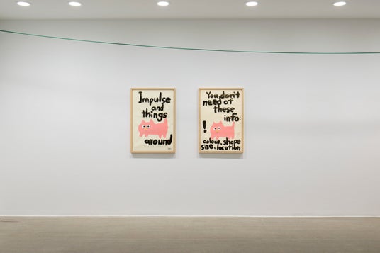 一方Threeでは、平面作品《レフリーストップ》シリーズに加え、開催中の水戸芸術館現代美術ギャラリーでの個展「飯川雄大 大事なことは何かを見つけたとき」のプランドローイング、《デコレータークラブ―ピンクの猫の小林さん》のペインティングなどを展示いたします。