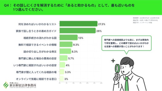 そうした話しにくさを解消するために役立つものとしては、「何を決めればいいかわかるリスト」(27.3%)、「家族で話し合うときの進め方ガイド」(26.0%)が上位となりました。